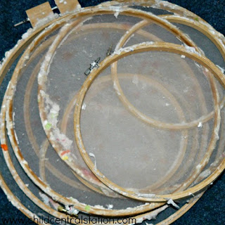 The paper mix starts to look like oatmeal, and we add some more water to get it ready to place on the forms. There are a lot of different forms you can use to put the paper pulp onto to dry. Some people use old window screens. We use embroidery hoops and tulle. Mainly because they are inexpensive and easy to adjust. (These forms have been used a number of times. You can see some of the residual paper sticking to them).